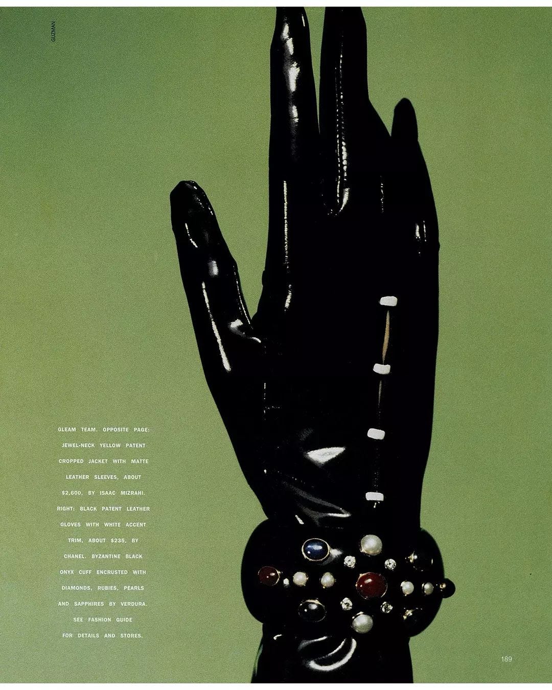 Saved because: Absolutely drooling over this patent-leather gloved hand and Chanel Byzantine cuff photograph from 1991 with my favorite shade of matcha green backdrop. On my list of items I must own in my lifetime is definitely a Chanel Byzantine cuff….one day.