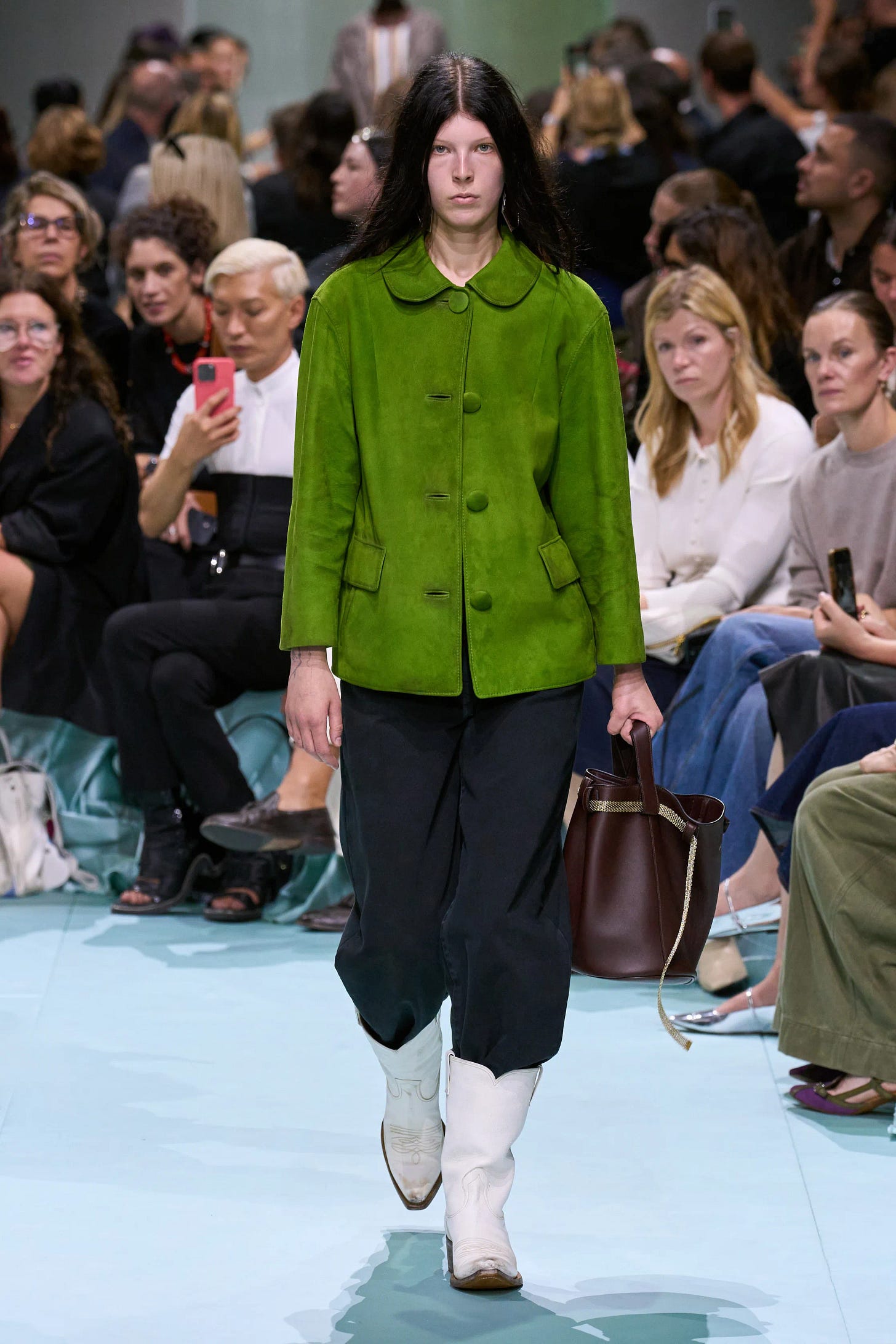 The collection also saw the return of many iconic Prada house codes: studs, distressed leather, silver eyelets, winged footwear, unique selections from the color wheel, duck-shoe details, mirrored palettes, etc.—mixing soft and hard in the expert way only Miuccia can. My most favorite detail was the recurring, upturned collars that look like they just came out of a spring rainstorm, specifically one on a pale pink trench coat.