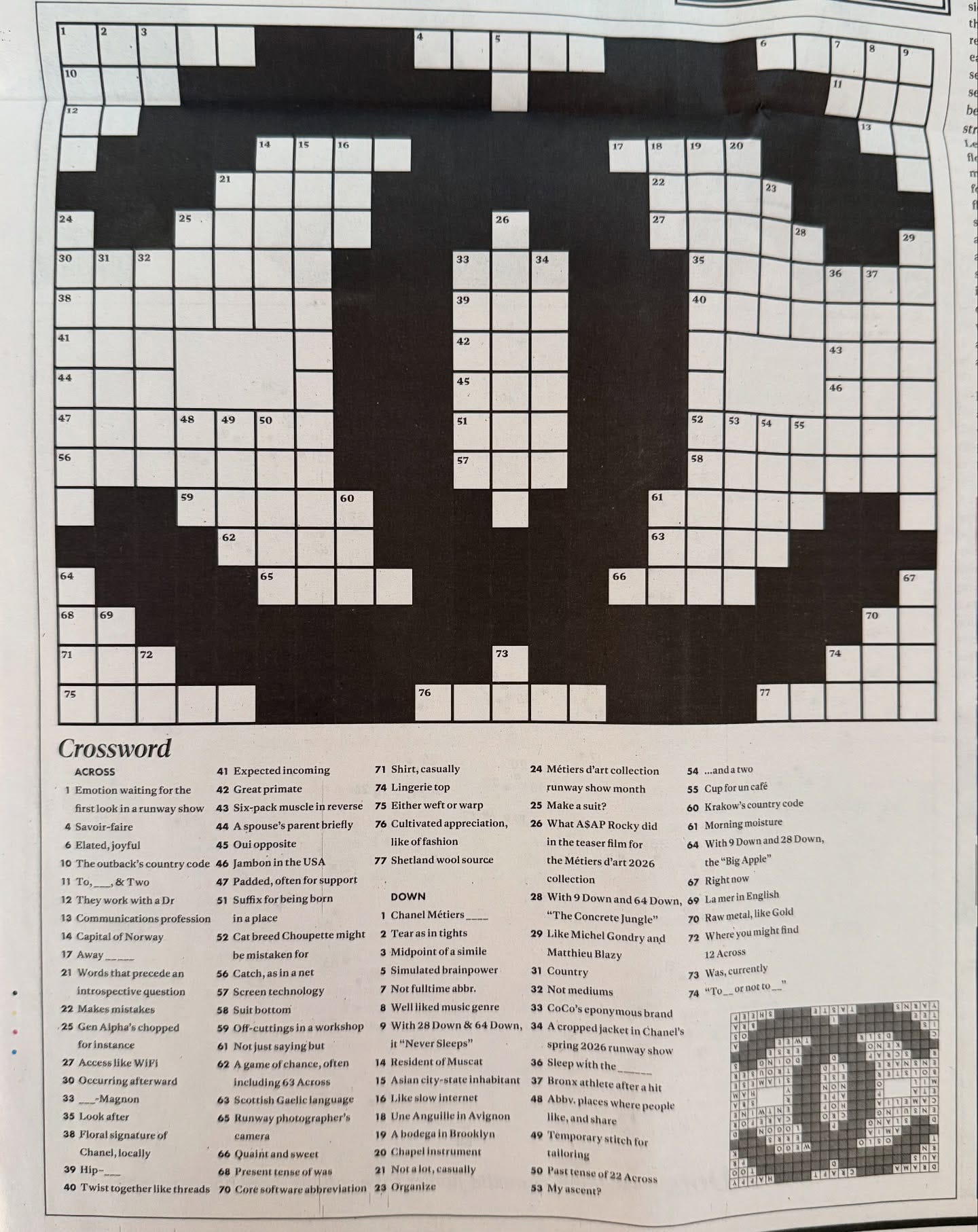 Saved because: Matthieu Blazy takes Chanel’s Metiers d’Art annual show to NYC this year, this week in fact, on Tuesday. For what I presume is the invite, Chanel provided guests with a custom newspaper, my favorite page being this playful crossword puzzle. I love to see some cheek back at Chanel.